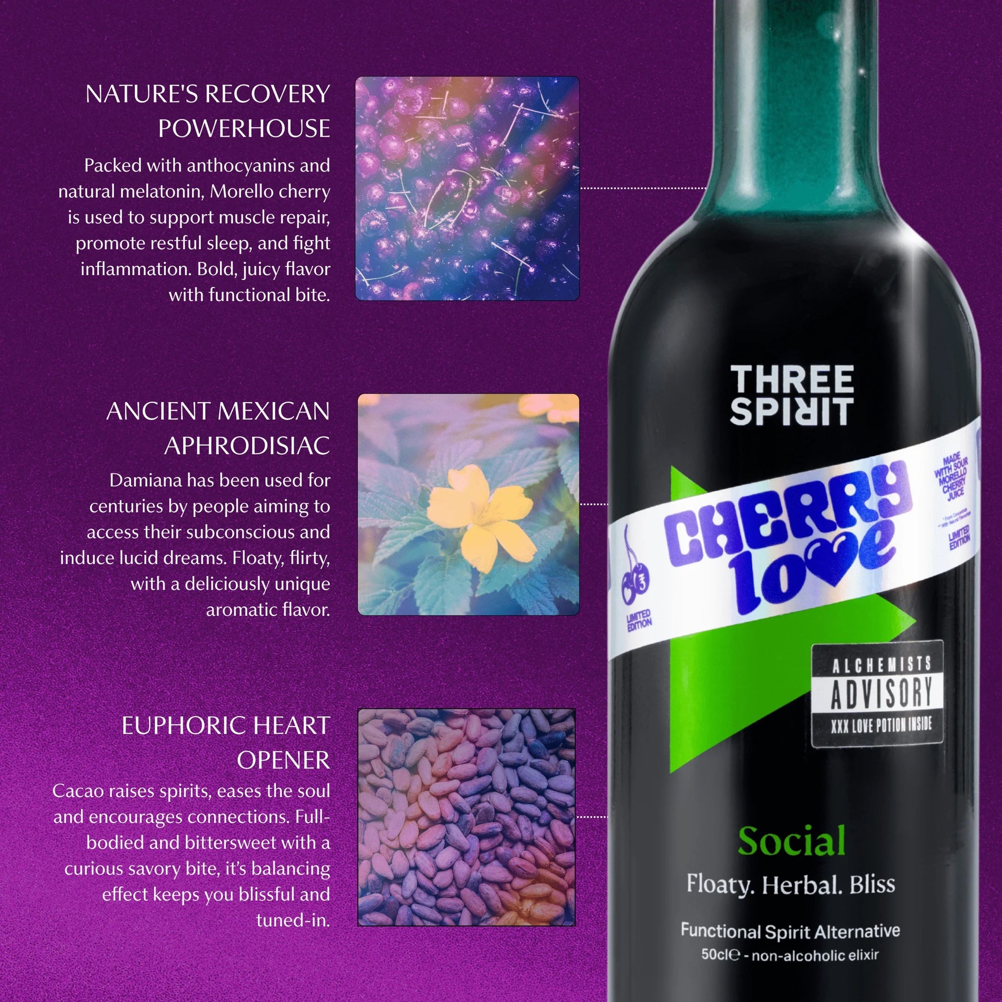 Get in the mood and stay in the moment. Extra damiana and Morello cherry amplifies Social's mood-enhancing aphrodisiac blend while adding layers of complexity and a touch of playful seduction.